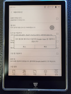 2021년 3월 10일에 나온 것 외 보카 업데이트가 있어 업데이트 클릭.역시 최신 전자책이라 처리속도가 무척 빨라.이전에는, 전자 서적에는 안드로이드로 구형 버전에 AP도 저사양을 넣어, 항상 느린 편이었지만, 격세의 감금으로 다운로드가 끝나, 인스톨까지 완료.플레이스토어 설치의 다음 절차는 ‘플레이스토어 설치→오닉스 포크3’는 구글 플레이스토어가 기본적으로 사용 설정되어 있지 않아 사용자가 활성화 해야 한다.